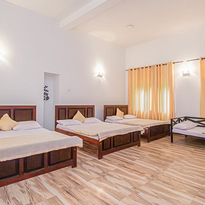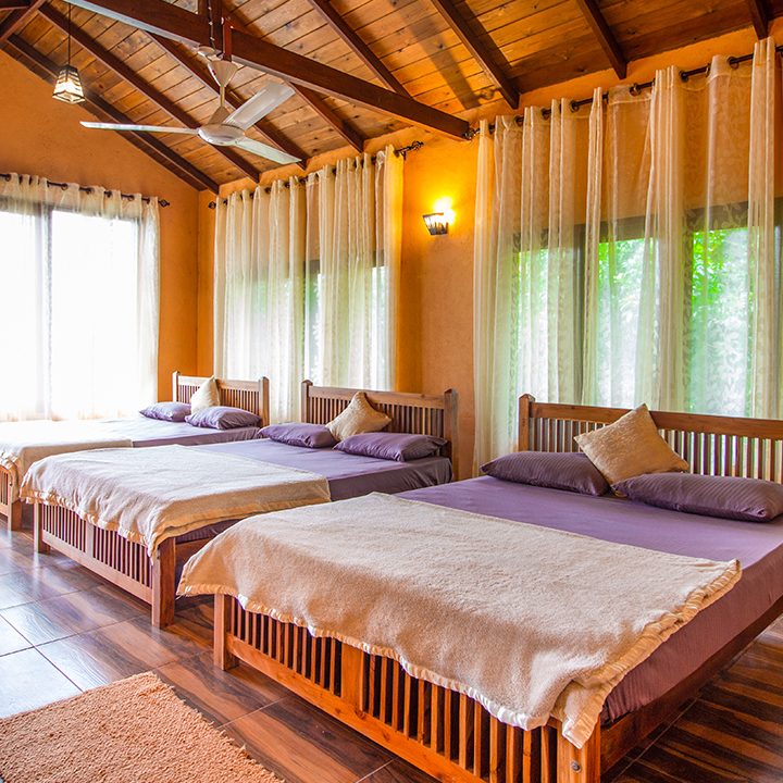 There are four accommodation units in the holiday home. One is having 4 beds to accommodate 8 adults comfortably. Other unit is having 3 beds to accommodate 6 adults comfortably. There are two other bedrooms 6 adults can stay comfortably. All are having attached bathrooms with hot water facility. In addition we have a champing tent which can accommodate 4 people in our garden setting. There is no need for A/C since the climate condition in the area is cool and very comfortable.